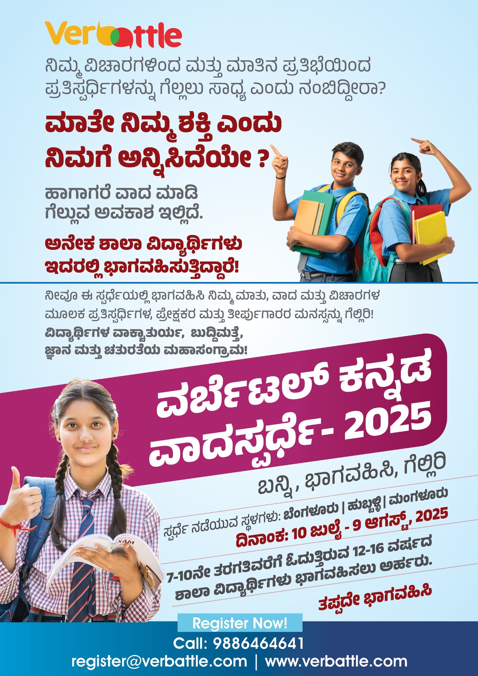 Team Verbattle earnestly thank all the schools that have actively participated in Verbattle Karnataka 2024 Debate Championships - Alpine Public School, Bengaluru/Amrita vidyalayam, Bengaluru/Chandana English Medium School, Sirsi /Chinmaya Vidyalaya, Hubballi/Chinmaya PU College Of Science And Commerce, Hubballi/Deens Academy, Gunjur, Bengaluru/Deens Academy, Whitefield, Bengaluru/Devin Academy for Learning, Bengaluru/DPS East, Bengaluru/DPS Electronic City, Bengaluru/DPS North, Bengaluru/DPS South, Bengaluru/Dr R. B. Patil Mahesh PU College, Hubballi/Fatima Composite PU College/Global Indian International School, Bengaluru/Gopalan International School, Bengaluru/Gopalan National School, Bengaluru/HMR International School, Hennur, Bengaluru/Jain Heritage School, Bengaluru/Kensri School & College, Bengaluru/KLE College of Commerce, Hubballi/KLE Manjunathanagar, Hubballi/KLE Society's School,Rajajinagar, Bengaluru/KLS Public School, Belagavi/Lawrence High School ICSE, Bengaluru/Legacy School, Bengaluru/Little Rock Indian school, Bramhavar/Mount Carmel Central School, Bengaluru/Nagarjuna Vidyaniketan School, Bengaluru/National Hill View Public School Unit 2, Bengaluru/National Public School, Yeshwanthapur, Bengaluru/Rashtriya Military School, Camp Bengaluru/Rashtriya Military School, Camp Belagavi/Royale Concorde International School, Kalyan Nagar, Bengaluru/RVS International, Khannur, Hubballi/Sacred Heart English Medium School, Hubballi/Sanskaar English Medium School, Hubballi/School of India, Bengaluru/Sindhi High School, K K Road, Bengaluru/Sishu Griha School, Bengaluru/SJR Public School, Bengaluru/SSM Public School, Bengaluru/SSP International School, Davanagere/Sri Sri Ravishankar Vidya Mandir, Bangalore South, Bengaluru/St. Antony's Public School, Hubballi/St.Mira's High School , Bengaluru/Sudarshan Vidya Mandir, BG Road, Bengaluru/Sudarshan Vidya Mandir, ICSE, Bengaluru/Sudarshan Vidya Mandir,CBSE, Bengaluru/The Brigade School, J.P.Nagar, Bengaluru/The Brigade school, Malleshwaram, Bengaluru/The Cambridge International School, Bengaluru/The HDFC School, Bengaluru/Vidyaniketan Public School, Ullal Bengaluru/Vidyanjali Academy for Learning, Bengaluru/Vidyashilp Academy, Bengaluru/Young Scholars Academy, Bengaluru